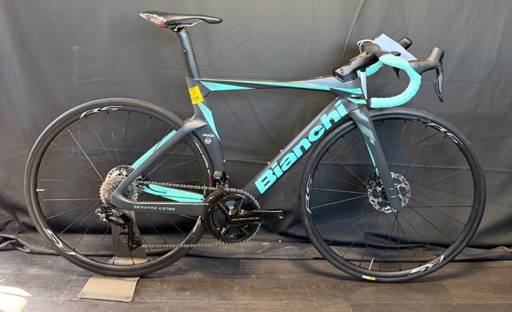 Bianchi Oltre RC T.53 équipé en Shimano Dura-ace Di2 12v avec une paire de roues alminium.