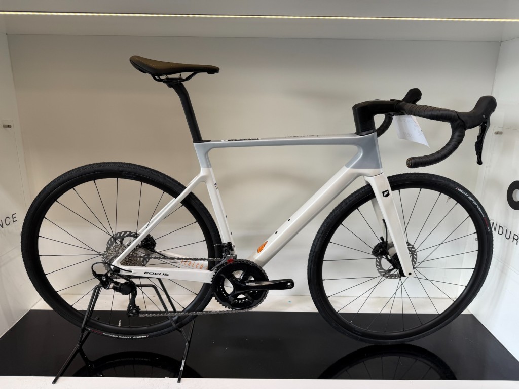 Focus Izalco Max 8.7 gris et blanc équipé en Shimano 105 2x12v avec une paire de roues aluminium Alexrims boondocks 5.