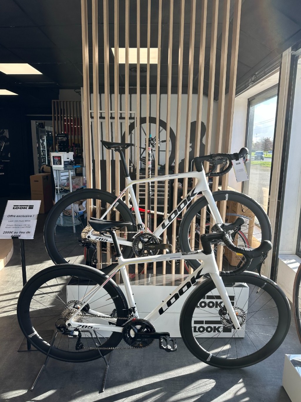 Look 785 Huez White équipé en Shimano 105 mécanique 2x12v avec une paire de roues carbone Look R50D